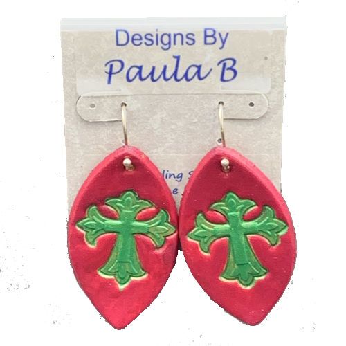 Handcrafted lightweight leather earrings with cross design. Emerald green and hot pink. Sterling silver ear wires.