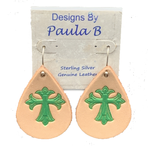 Handcrafted lightweight teardrop leather earrings with emerald green cross design and natural background. Sterling silver ear wires. Approximately 2" x 1 -5/16" size.