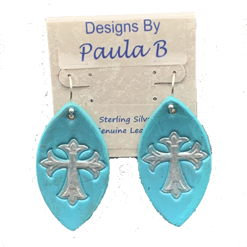 Handcrafted lightweight leather earrings with cross design in silver with turquoise background. Sterling silver ear wires.