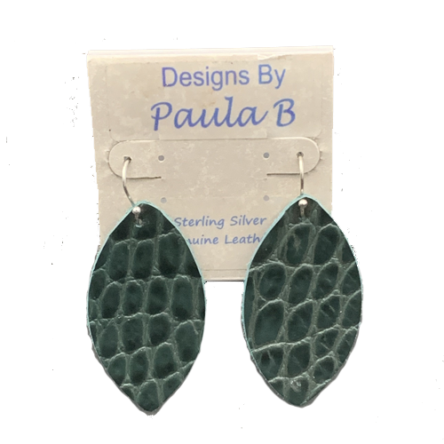 Handcrafted lightweight exotic leather earrings in green. Sterling silver ear wires.