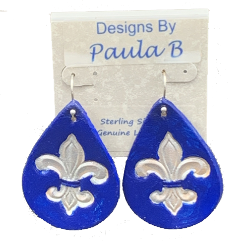 Handcrafted lightweight teardrop leather earrings with Fleur-de-lis design in silver with pacific blue background. Sterling silver ear wires. Approximately 2" x 1-5/16" size.