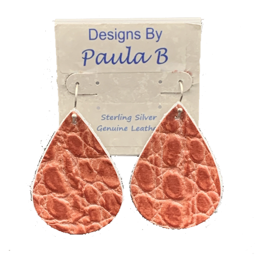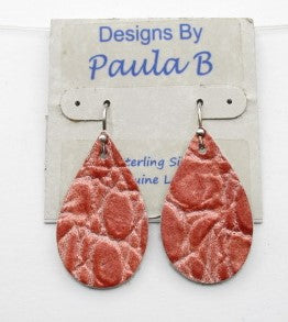 Handcrafted lightweight exotic leather earrings that are salmon in color. Sterling silver ear wires.