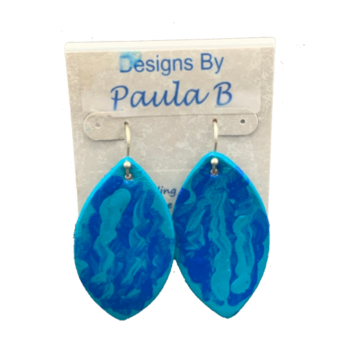 Handcrafted and hand painted lightweight leaf shaped leather earrings with sterling silver ear wires. Unique abstract design. Each pair with be different but the same general abstract design in turquoise and pacific blue. You will be the only one with this unique pair of earrings.
