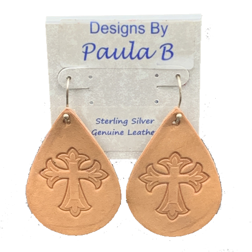 Handcrafted lightweight natural leather earrings with cross design. Sterling silver ear wires.
